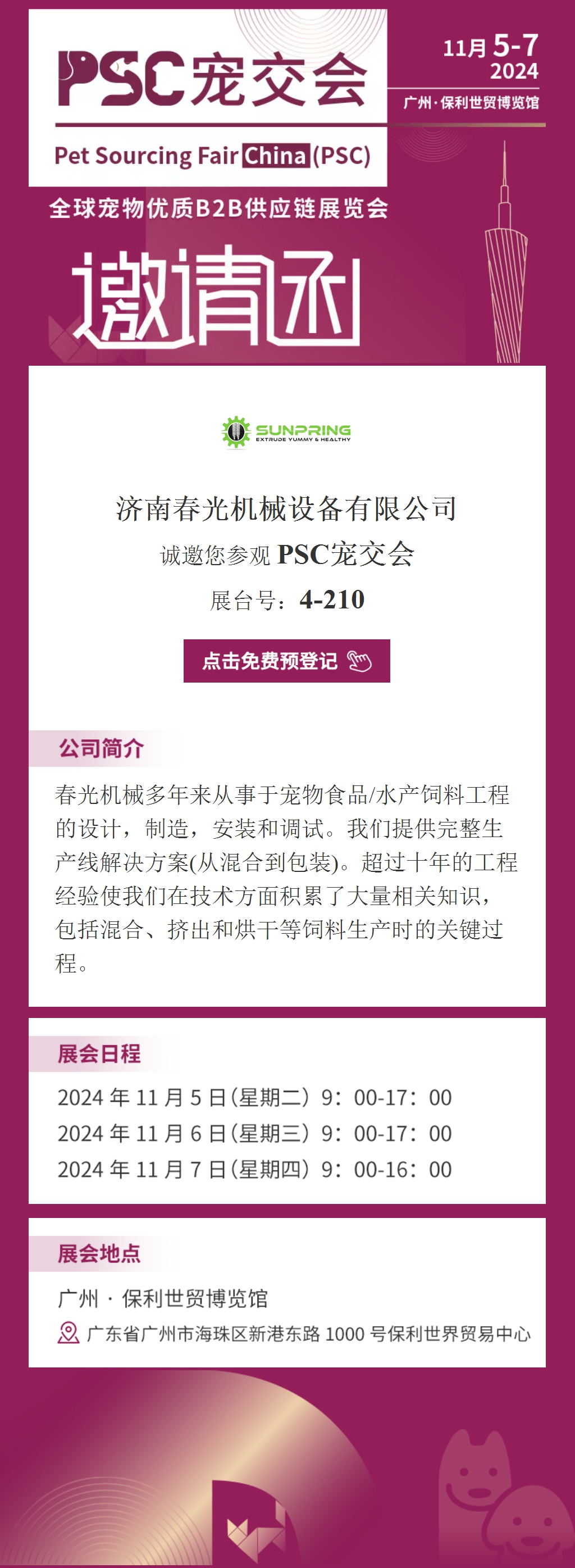 您现在的位置:首页> 新闻中心 > 新闻中心 >> 展会信息 >> 济南春光机械设备有限公司 诚邀您参观 PSC宠交会