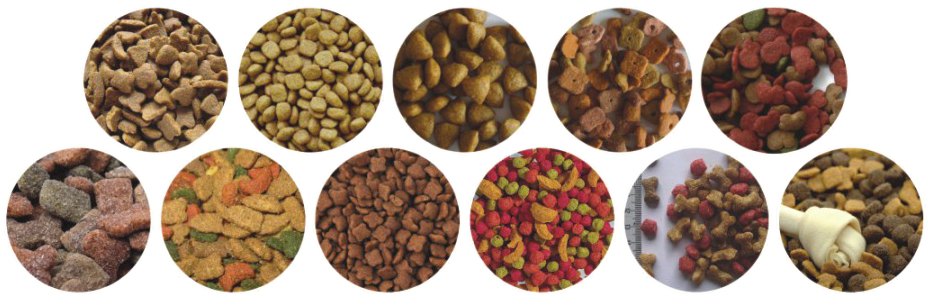 3. 产品: 各种形状狗粮、猫粮、鸟食,鱼饲料等,根据不同的配方,工艺做出不同的宠物食品